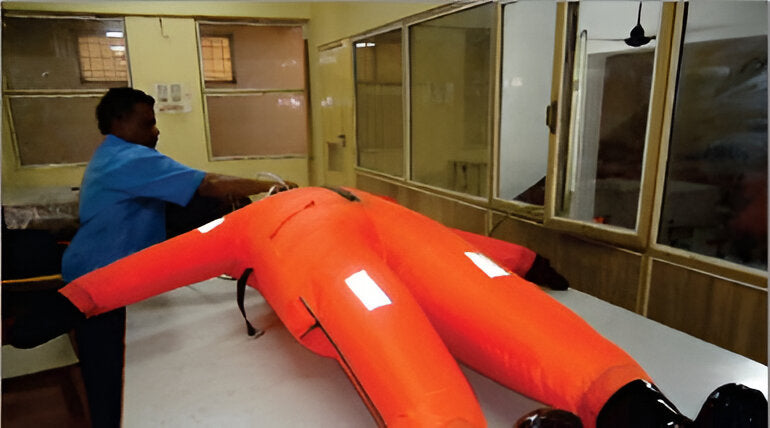Our technician injecting air into the immersion suit as part of the periodic air pressure test routine at our maker and class approved facility.