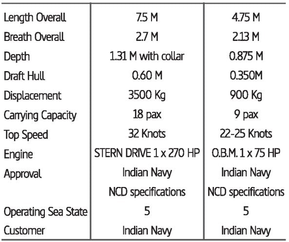Designed and constructed specially for the Indian Navy, our RIB is a lightweight, high-performance craft that spans a length of either 7.4M or 4.7M, depending upon client requirements and has a top speed of 32 Knots. Propelled by an inboard stern drive engine, our RIBS enable military personnel to cope better with high speeds and rougher seas due to their dependable stability and secured ruggedness.
